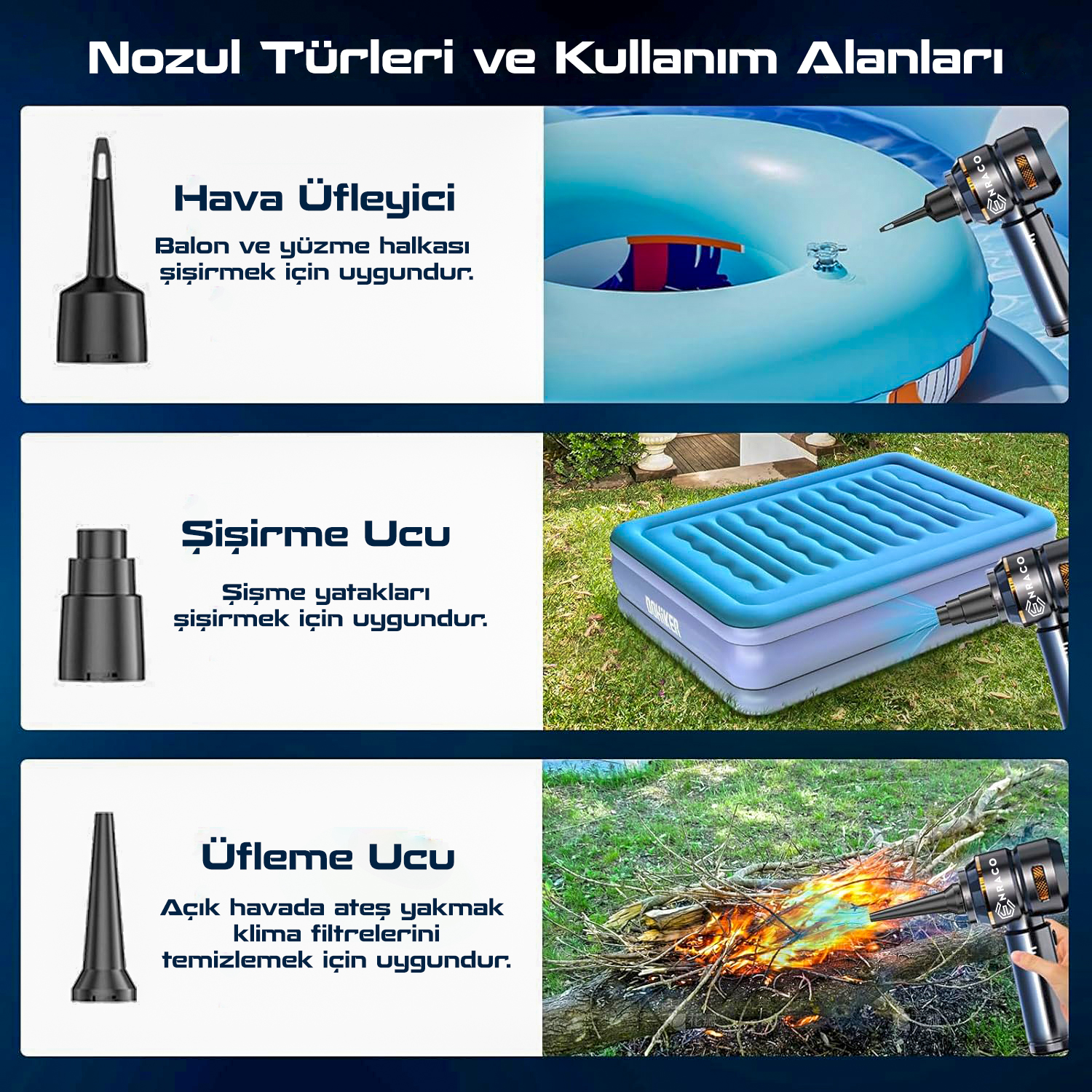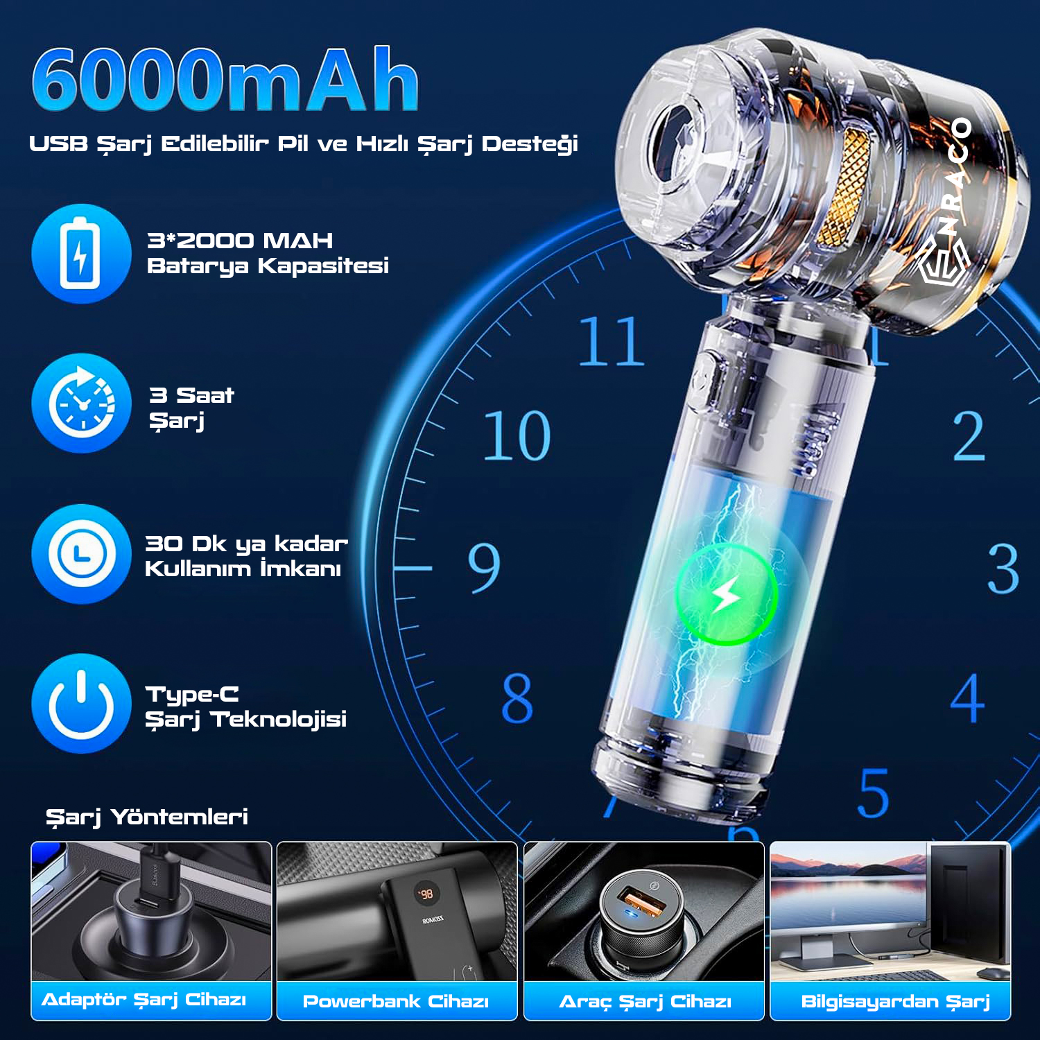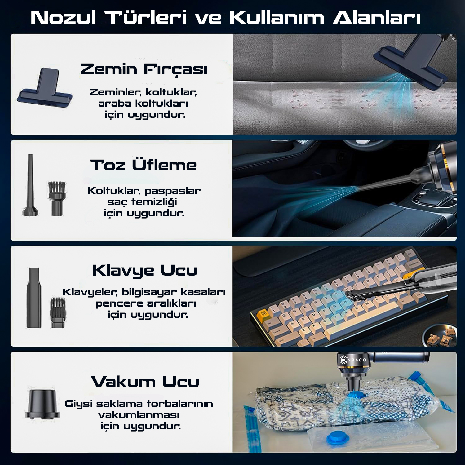 Enraco Güçlü Portatif Taşınabilir Vakumlu Kablosuz Üflemeli Mini Araç Süpürgesi